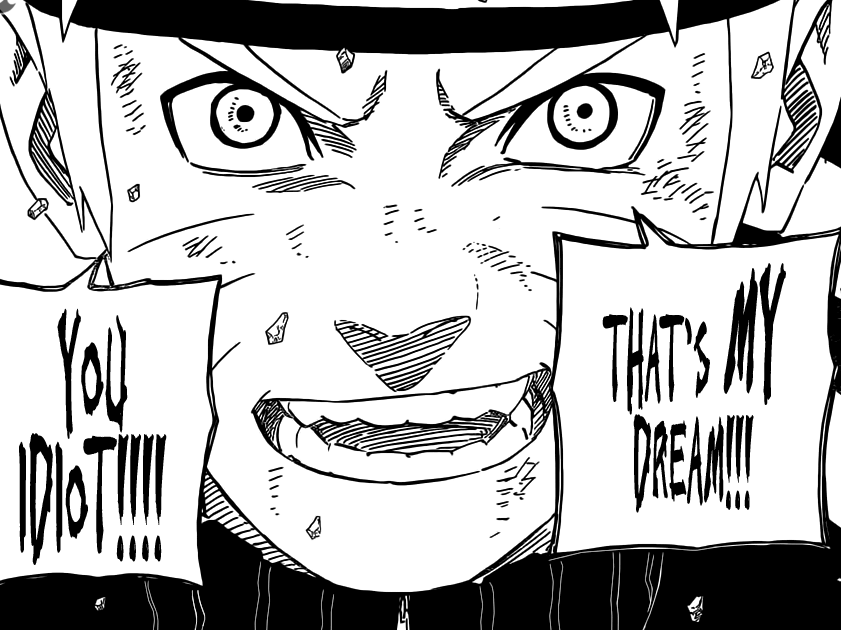 Tobi tells everyone that Earth doesn’t need heroes, hope or the future. At the Ten Tails Revival, he would be able to use his Infinite Tsukuyomi to ends this reality. Naruto asks Kurama to change back, and he does. Naruto begins his  inspiring speech by saying that, he had a father, a mother and even Jiraiya. He tells Tobi that all kids look up to heroes, that’s why he wants to keep running forward to become a Hokage. Kurama smiles. Naruto tells Tobi his dream! Gai and Kakashi also reveal that dreams do come true. Killer Bee reveals his dream of a middle-aged woman’s chest.