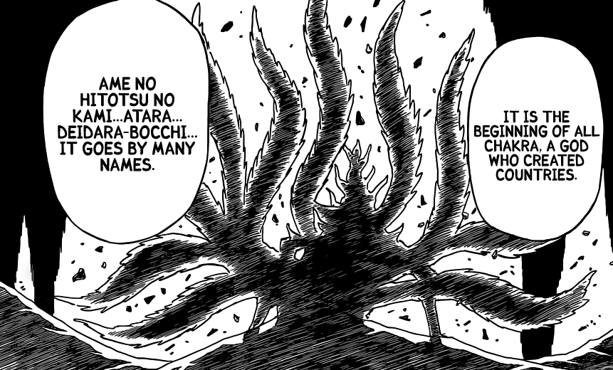 Kurama tells Kakashi that now is his only chance before the Ten Tails is revived to do something about it. Kurama also tells everyone that the Sage of Six Paths had told them that the revival of the Ten Tails will signal the end of this world. Naruto asks Kurama is the Ten Tails is really that strong. Kurama goes on to tell Naruto that the Ten Tails also has a collection of all the chakra of all the Tailed Beasts. It is the beginning of all chakra, a god who created countries. They also have many names, it swallows oceans, splits the land, carries mountains and progenitor of all that exists in this world. Simply, it’s all 9 Beasts combined.