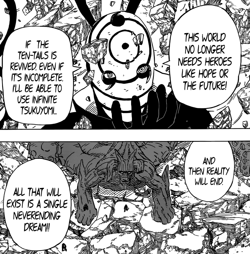 Tobi tells all of them that the Ten Tail’s Revival doesn’t need to be perfect for his purpose. His goal is simply to use the Great Genjutsu Infinite Tsukuyomi. He wants to cast this technique on everyone in the planet, to make the world one and free of anyone. There would be no war, no peace, nothing, just a perfect world.