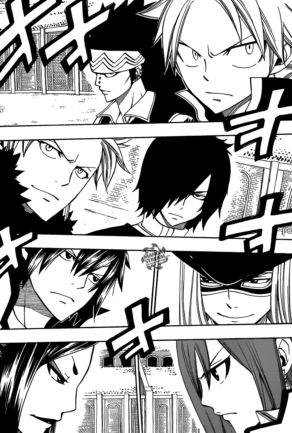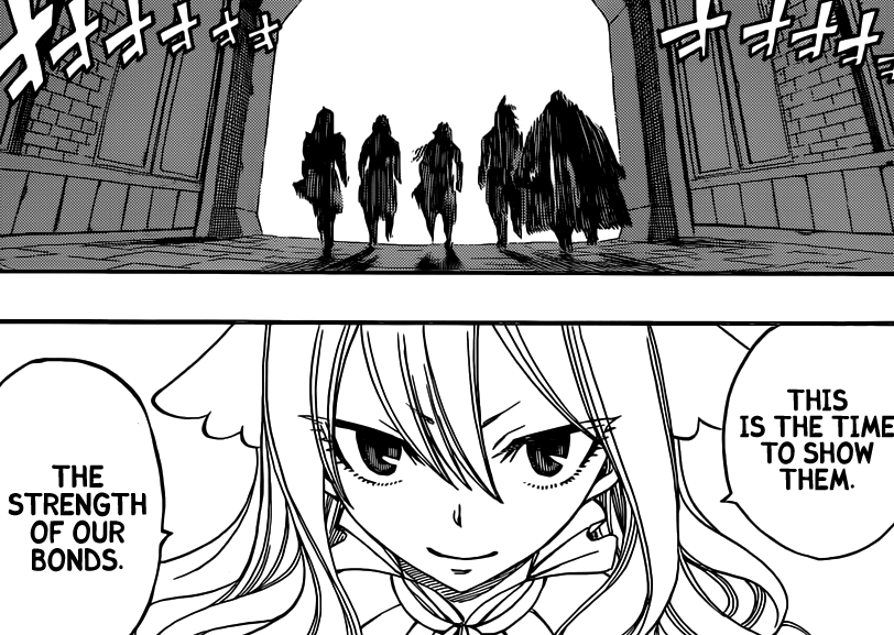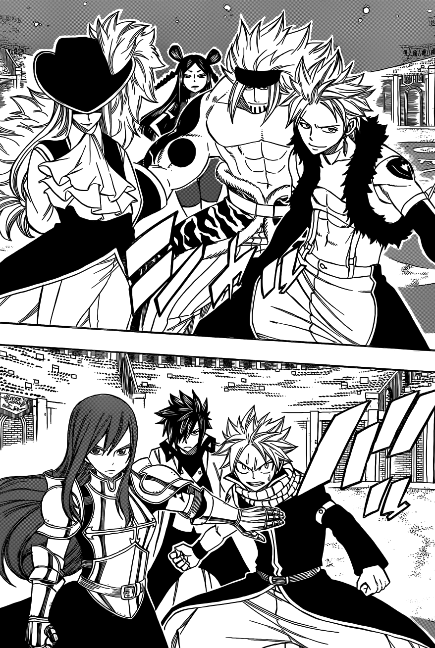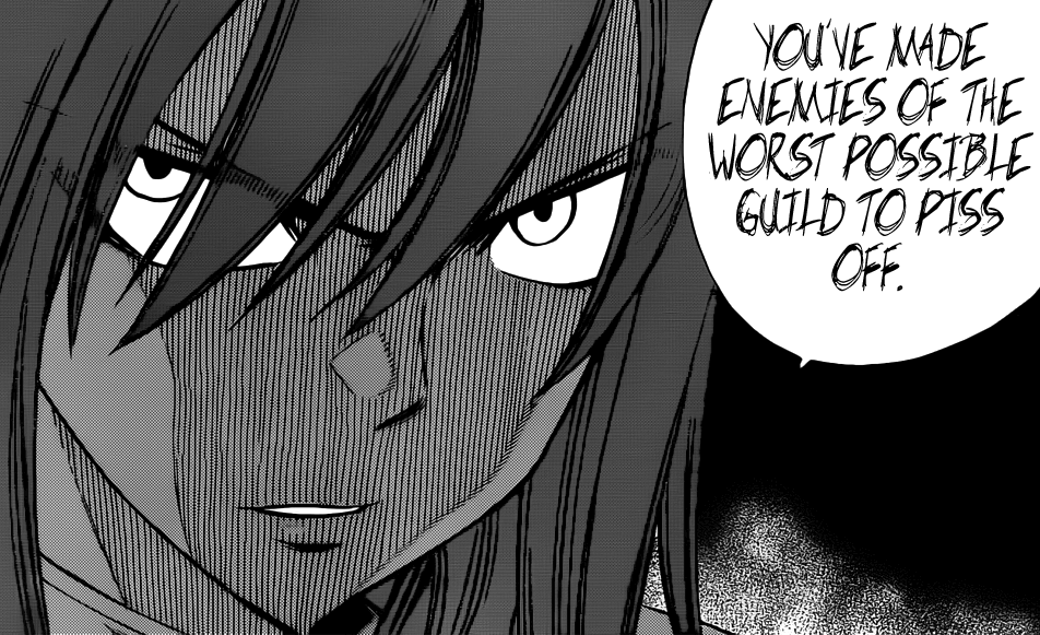 Natsu quickly turns and everyone except Rogue turns up to help Minerva if there was any issue. Gray and Natsu are both stopped by Erza because they shouldn’t be fighting at this point. Erza doesn’t care if Sabertooth is the top guild in Fiore, but she does tell them this.