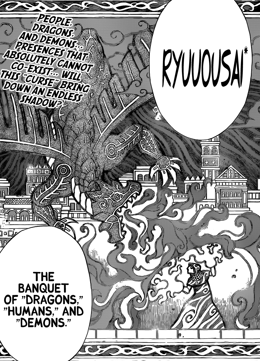 Natsu tells everyone that he’s all fired up to fight to fullest! Datong shows us that this “Festival” was called something else a while ago, it was called Ryuosai (Literally Meaning The Dragon King Festival), which refers to the banquet of dragons, humans and even demons! Fairy Tail 292 ends here!