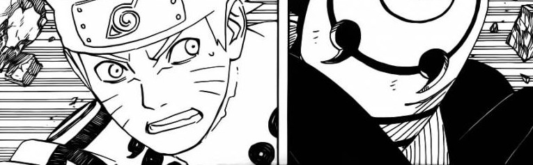 Tobi falls down, he then gets up to find out that Naruto didn’t stop his Rasengan, Kakashi used his Kamui to send it to another dimension. Kakashi finally tells Tobi that he now knows whats going on. Kakashi tells everything that he first thought the Tobi was using two jutsu to dematerialize and the other to appear and disappear. But in fact he was only using one! Naruto 596 ends here!