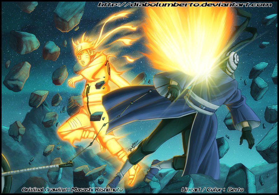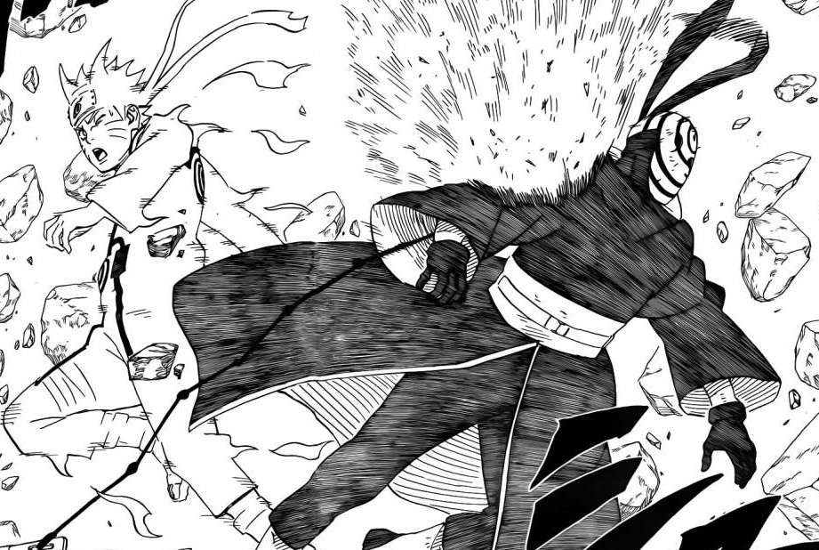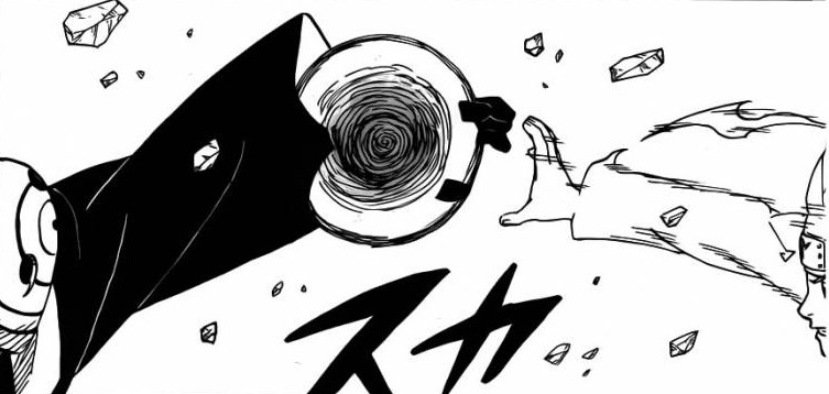 From nowhere, Naruto arrives with his Rasengan. Tobi tells him that it’s useless for him to do such a thing. Naruto’s Rasengan goes through Tobi’s hand, as it goes more and more towards the face, Naruto’s Rasengan disappears, their bodies mix when they have to look back, their bodies have fully gone through when Kakashi uses his Kamui! This captures Tobi’s arm in the action ripping everything around it.