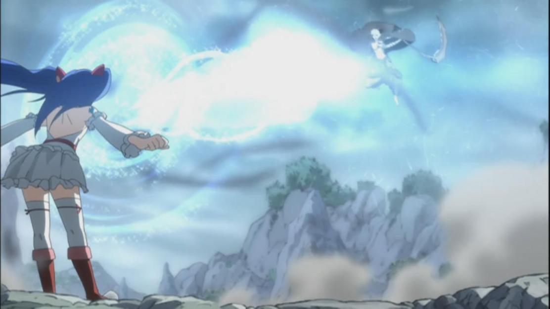 We now go to where Wendy is healing Bickslow while Grim Reaper watches, he hits Wendy with one shot pushing her back, but she keeps on going to heal Bickslow because she doesn’t want to give up on a friend, Grim Reaper attacks but it doesn’t push her back, this time she uses her healing magic to bring back from memories of Grim Reaper.
