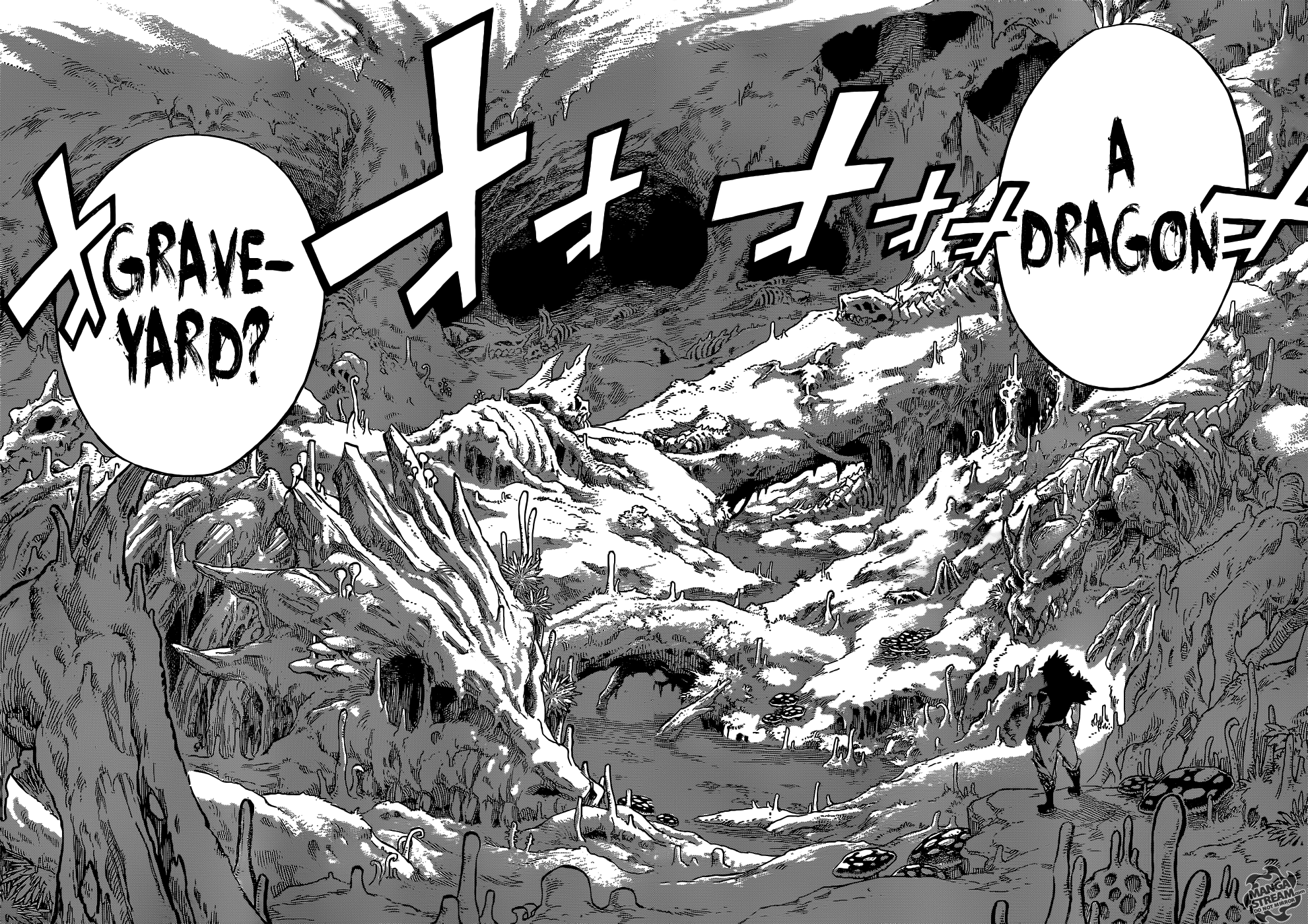 He tells himself that he’s going to kill Natsu for doing this to him, he asks himself where he is. He keeps on walking when he finds something shocking! He looks upon a graveyard of an endless number of dragons which lie throughout this cave.