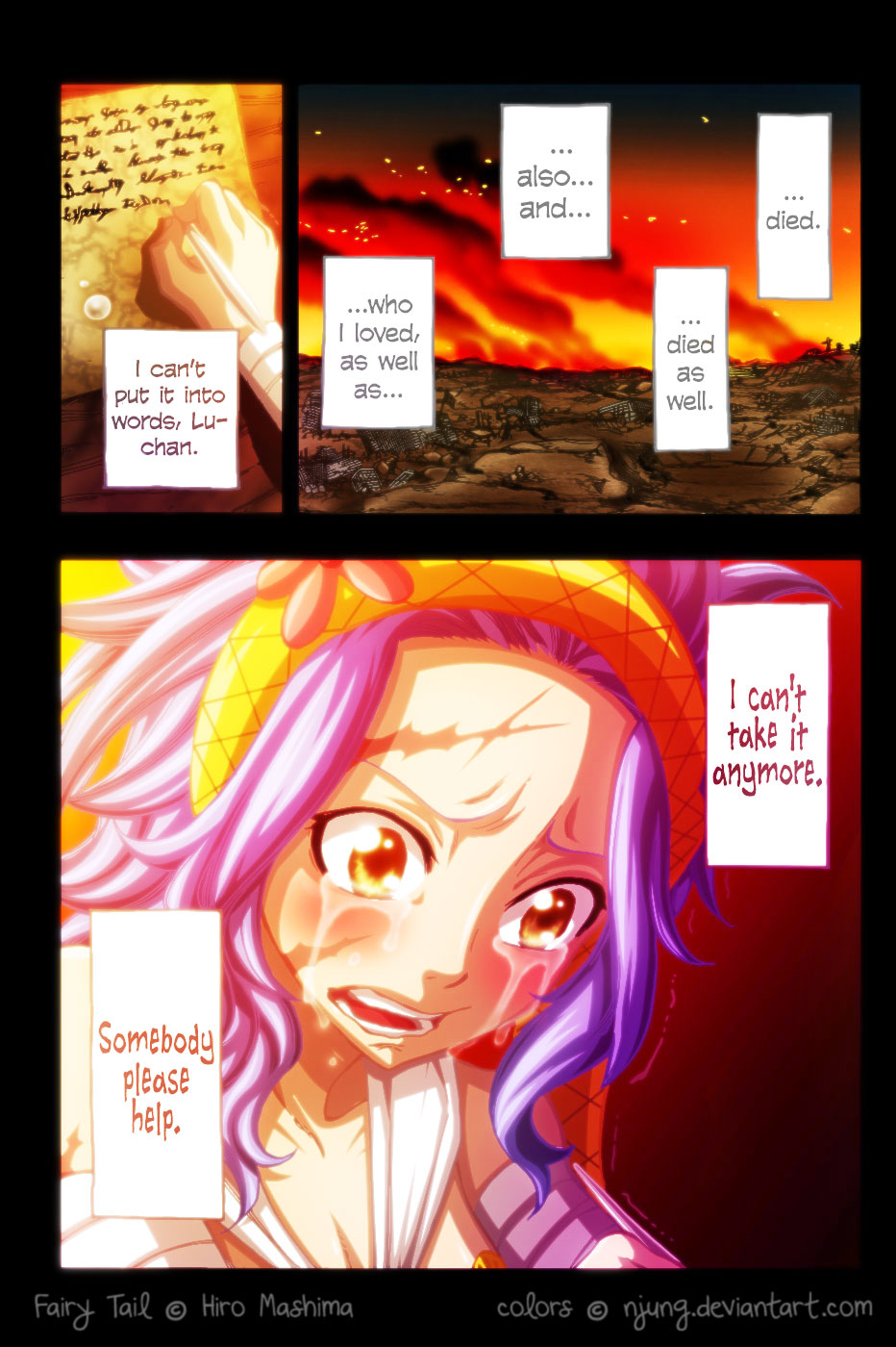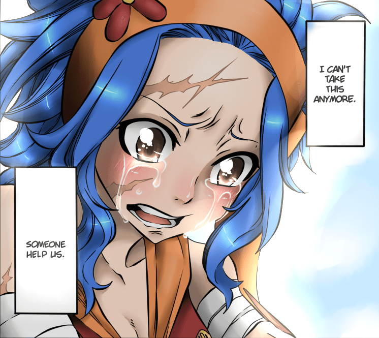 Levy asks where Gajeel is, she asks any of the others if they’ve seen him. Elfman responds that he’s probably eating from iron somewhere. They just decide not to check up because he will sooner or later show up. We hear a voice which refers to this day they believed in victory, but the next day, 7th July they lost to fate. We see Levy mention that a lot of people died, the person who she loved, possibly Gajeel also died. It’s as though she can’t put it into words. She cries as she writes.