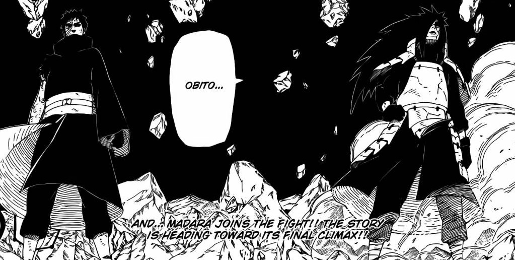 Naruto 600 blows my mind because Madara Uchiha has finally joined Obito Uchiha in his battle with Naruto, Kakashi, Gai and Bee. We find out that both Obito and Madara have known each other in the past and that Madara could have thought him everything he knows!