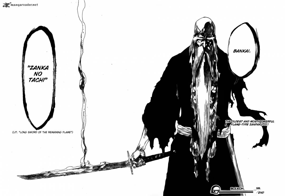 Bleach 506 is an exceptional chapter with huge load of epicness! Yamamoto has finally released his Bankai, named Zanka No Tachi (Literally Meaning Long Sword of the Remaining Flame). We also see Juha Bach also carry a sword which could mean that he could also be a Shinigami.