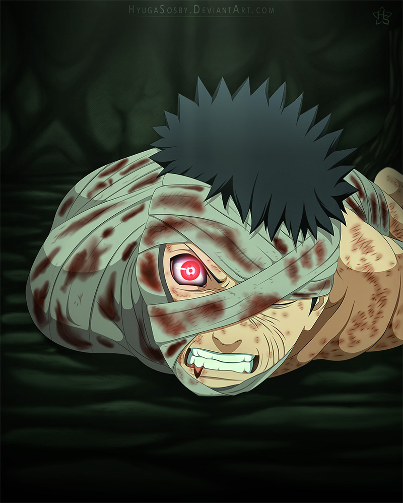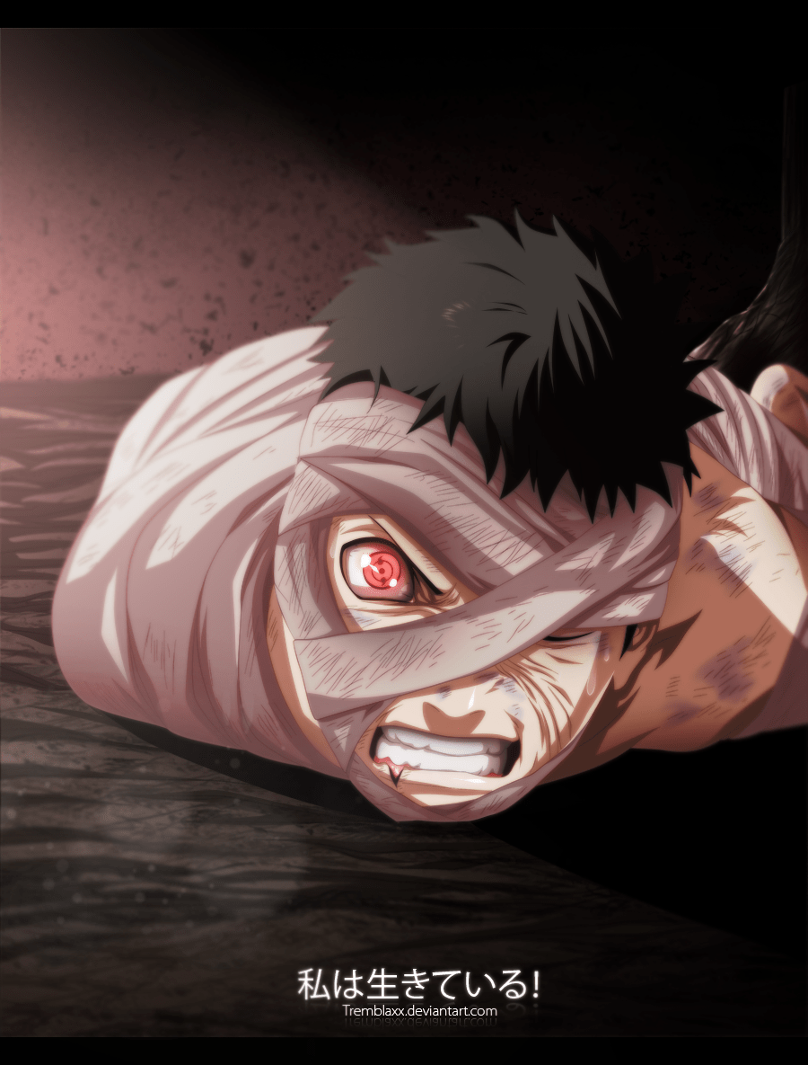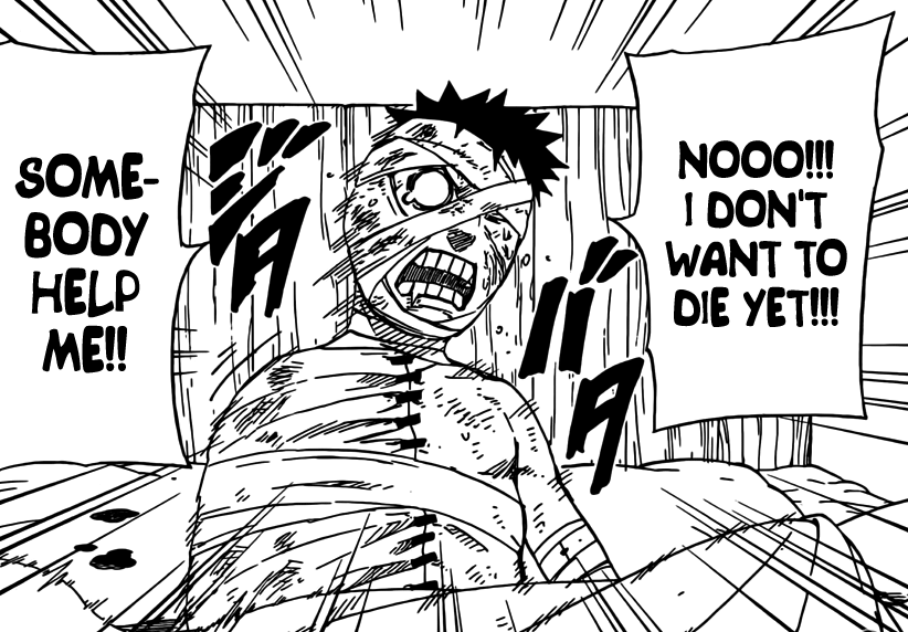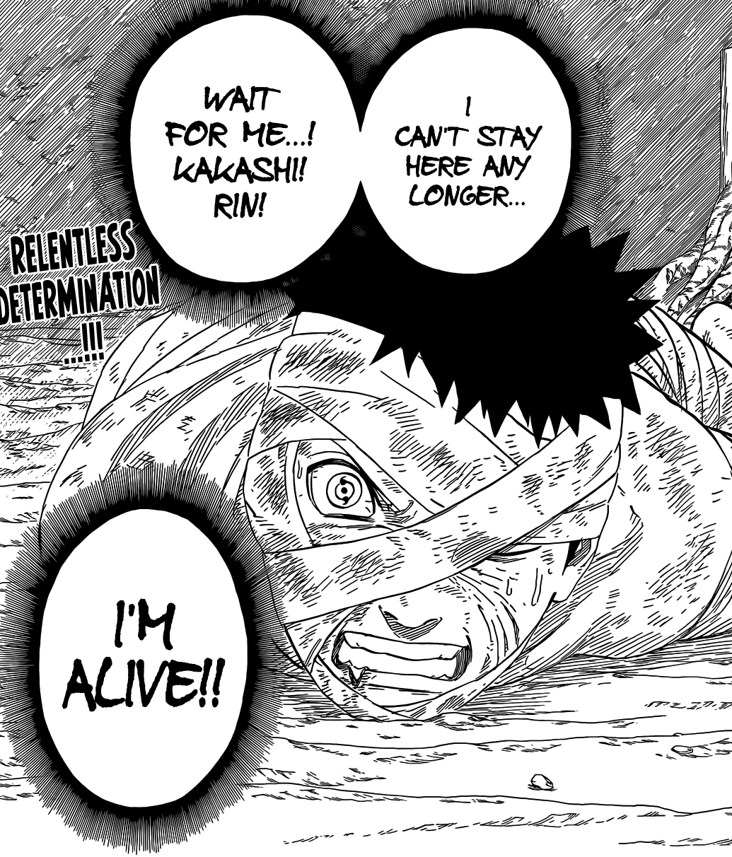 Obito quickly spots the sickle and shouts that he doesn’t want to die yet, and that he’s got to life and help everyone as well as follows his motto of Help The Elderly. He then feels the pain which he notices when he shouts. Madara tells him that if he feels pail then he knows that he’s alive.