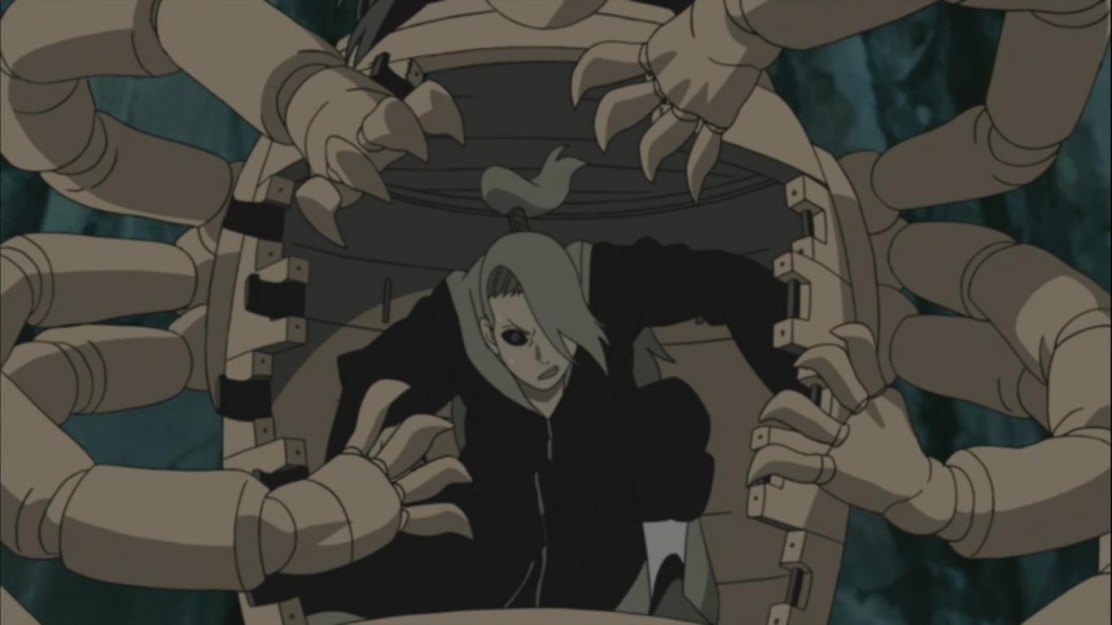 Deidara notices them and sets up land minds. At this point he tries to get away but at that point Kankuro’s puppet holds him, the lightning member is then able to hit, it doesn’t work. Deidara is happy now that he’s going to try and explode the person facing him.