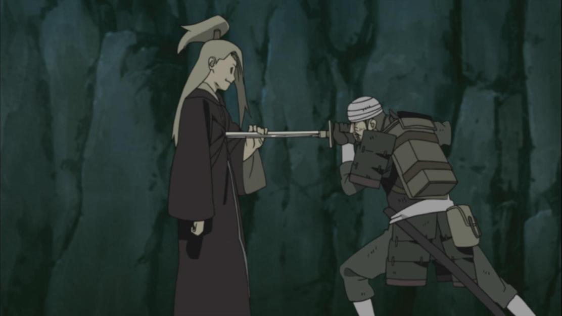 At this moment, Mifune arrives and quickly stabs Deidara, he tells him that it won’t work. He tries to blow up but doesn’t work because Mifune’s sword starts to spark. He reveals that he has a storage cell which he uses. At this point, Deidara tries to stab the ground but the sword breaks because it’s bed rock.