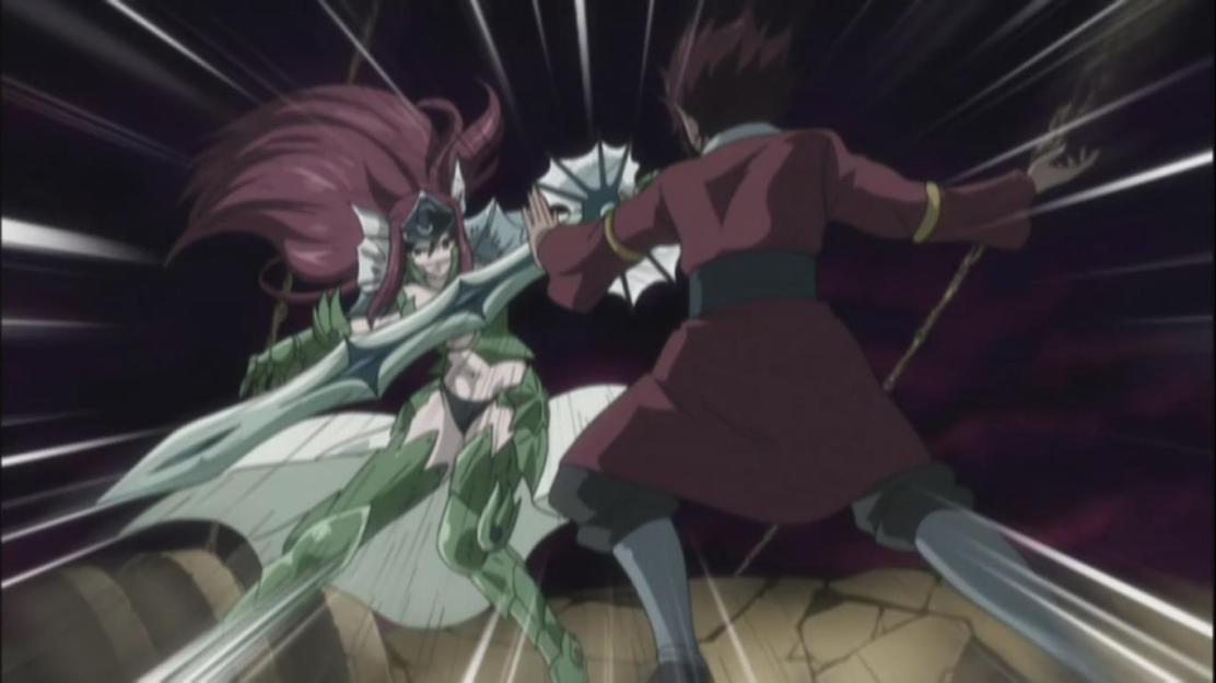 Her plan is to take the chain as well as Cobra all at once. She keep on attacking, Gajeel notices her power. Everyone is attacking and trying to break the chains. Kinana runs towards Cobra. Cobra starts to listen to Erza but doesn’t want to because of her words.