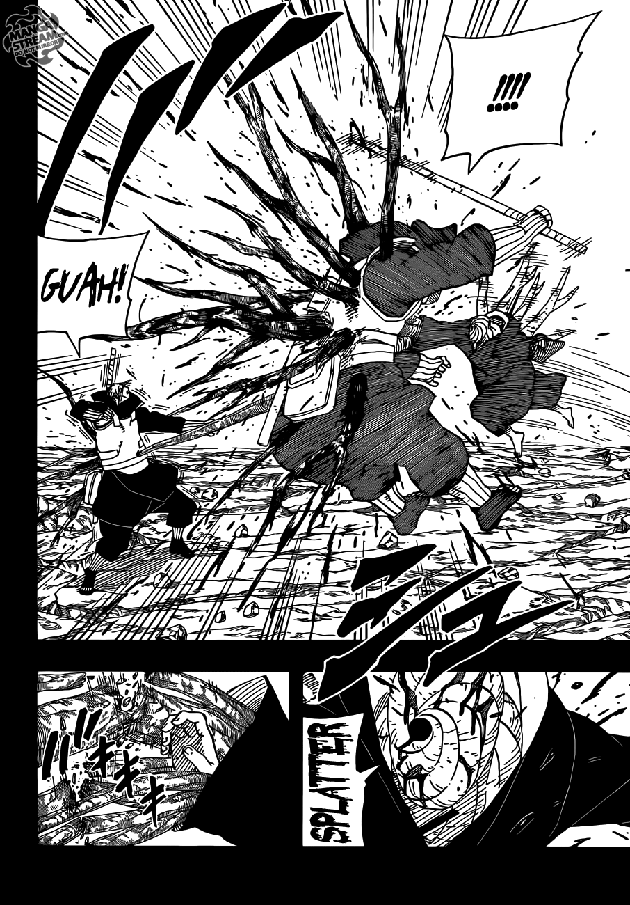 At this point, Obito is completely covered with blood from the mist ninja’s. Obito then uses his Genjutsu or his Mokuton to grow trees spanning towards the moon, in small spaces, it traps all the ninja’s within them, it then squeezes which bursts out blood from each and every ones body in the tree. At this point, blood rains from the skies towards the ground. At this point, Obito looks at the corpse of Rin saying that he’s in Hell. Naruto 605 ends here.