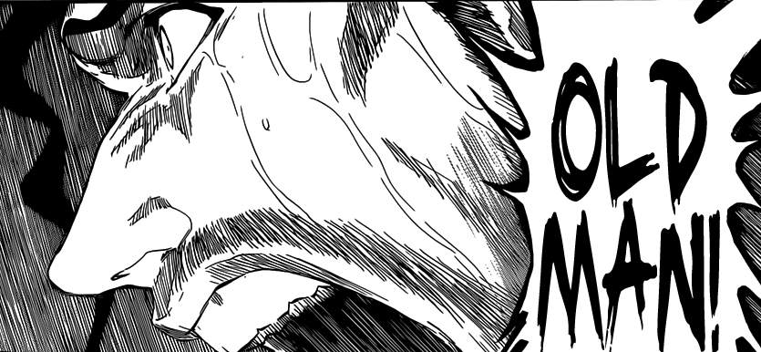 We see Yamamoto’s body drop dead whilst he still stands. He tells Shunsui that if it does appear again then he won’t be coming back. Shunsui feels the reiatsu of Yamamoto fluctuate and drop, he notices that something has gone very wrong and he shouts Old Man! He’s distracted by this and the Quincy who’s facing Shunsui takes the opportunity to attack!
