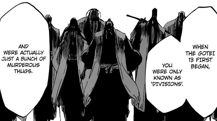 He then explains that the former Yamamoto was different. When the Gotei 13 first began, they were all known as divisions but were actually a bunch of murderous thugs. Because of this they were all feared. Yamamoto was the demon within that group who controlled everything.