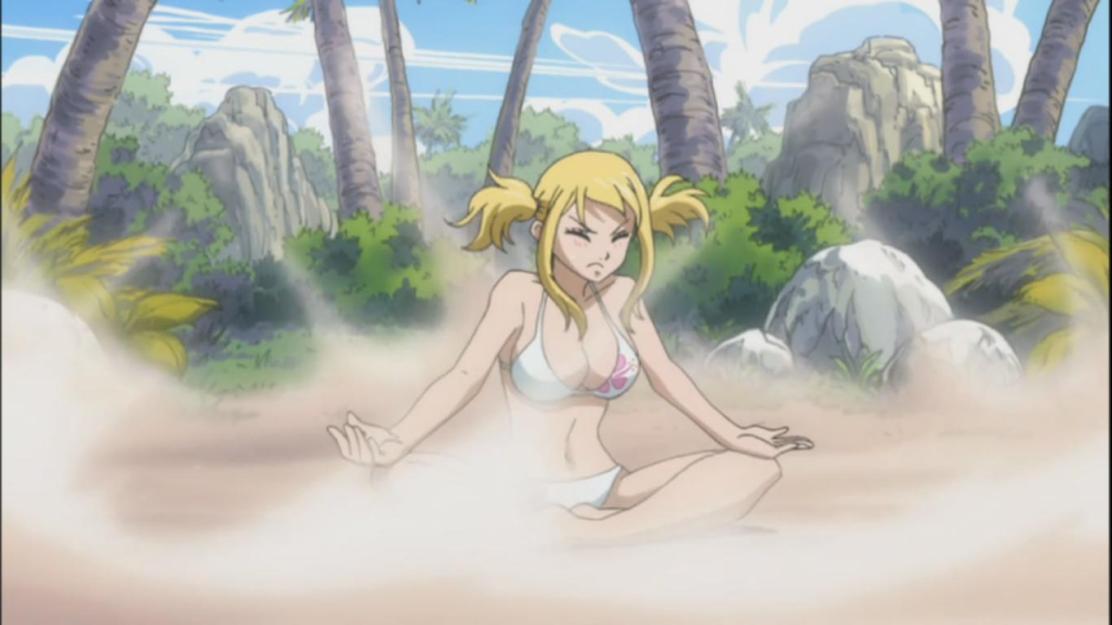 Lucy is also getting some help from. Capricorn is also there to help her out. He mentions for her to feel the nature around her in order to develop and improve her Celestial Powers.  She starts to get a circular sand thing going as she concentrates, but she wasn’t able to climax it because she got too tired.