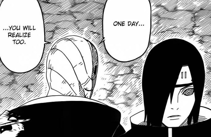 Obito says that when he’s able to master the real power of the Rinnegan, his world will be complete, Obito then asks for Nagato to come with him. Yahiko steps in and says that they can’t do that, he realizes that Obito is trying to use them because what he’s saying sounds too good.