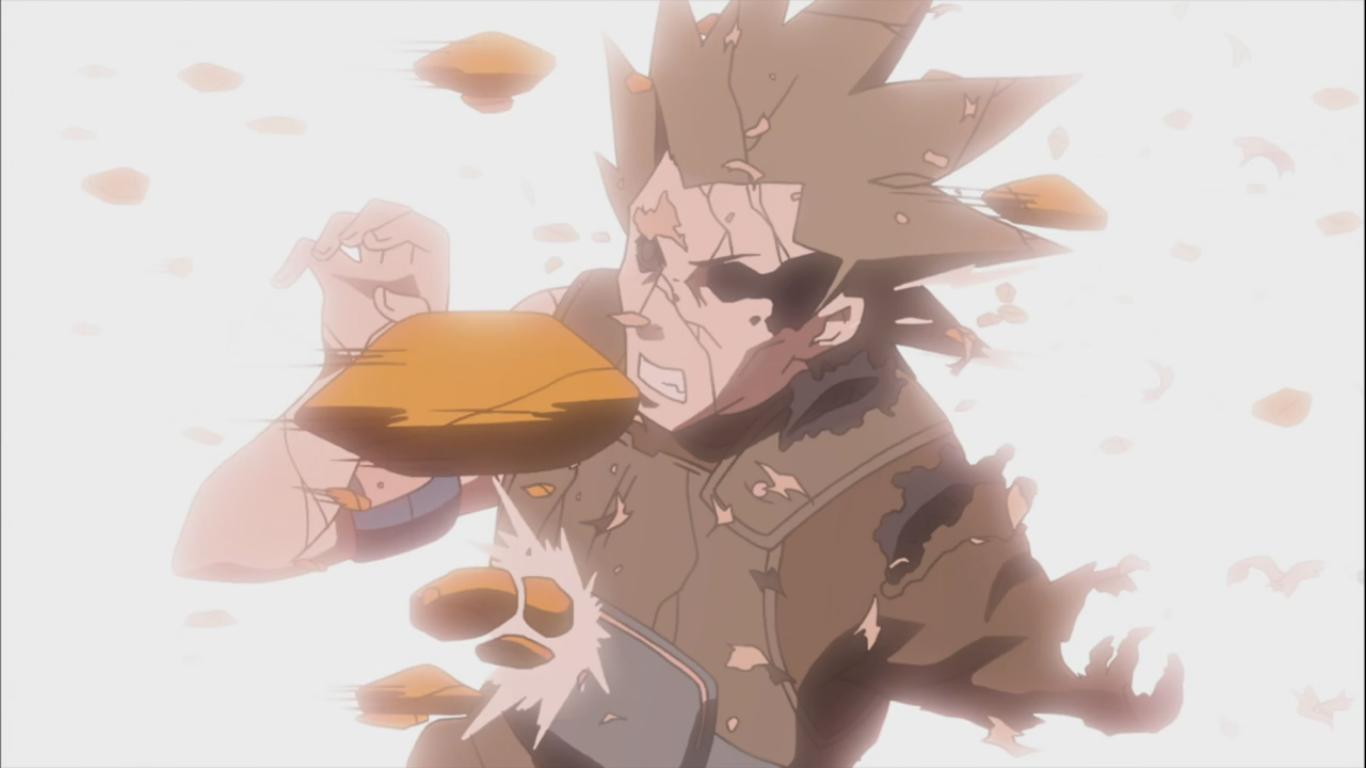 Monga uses his technique in which creates a wall of explosions scattering the body of Gari, this makes him go unconscious for a bit as he’s body is out of action, it will take him a while to get back into action. Monga asks Maki to quickly seal him when a red circle appears within Monga and he starts to die.