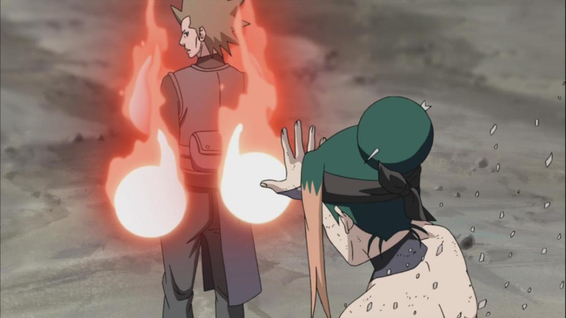 Pakura gets angry at Maki and shouts at Maki. She starts out by releasing her technique, Maki quickly uses her technique to disappear from the place. Pakura uses her jutsu to join the balls to create a large round in which she can burn a circle so she can see better.