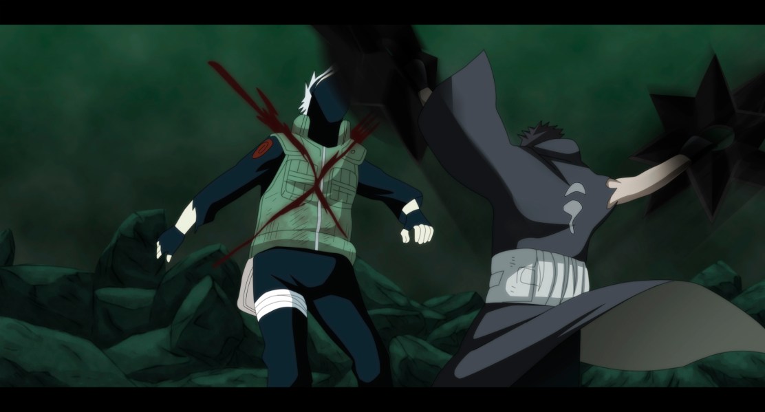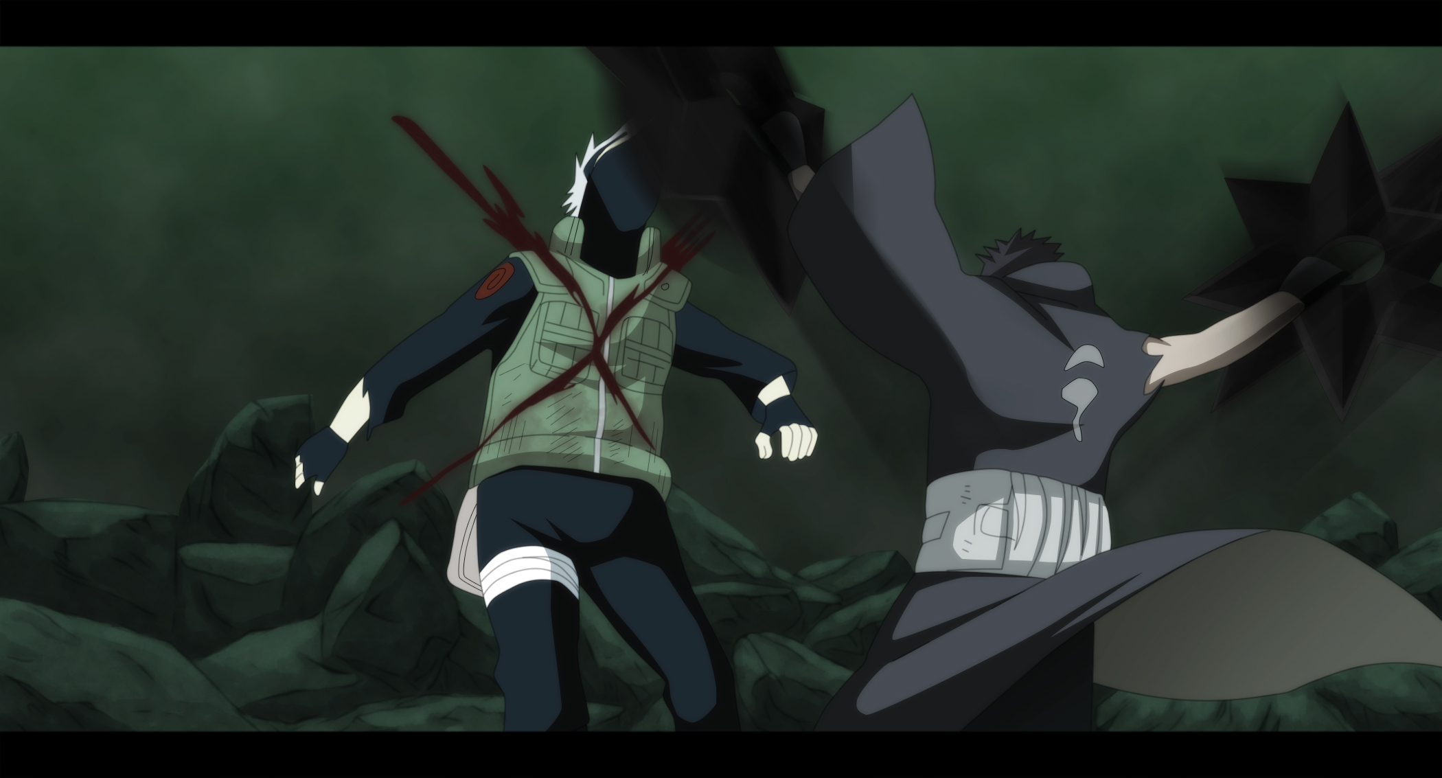 Obito quickly runs towards Kakashi at full speed, Kakashi unable to run because of the knee injury takes a knee attack right to the face from Obito. At this point, Kakashi keeps on remembering moments from his past with Obito, in which they propose that they should go and save Rin. At the same moment, Kakashi is taking a large beating from Obito.
