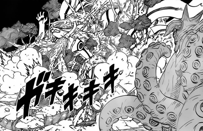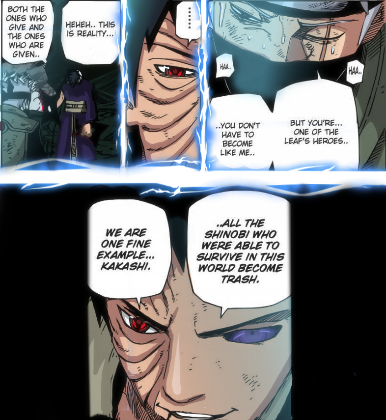 Obito giggles and tells Kakashi that both the ones who give and the ones who are given all the shinobi who were able to survive in this world become trash. Both Obito and Kakashi are trash. Kakashi is shocked at this. Naruto notices that Bee is also in trouble.