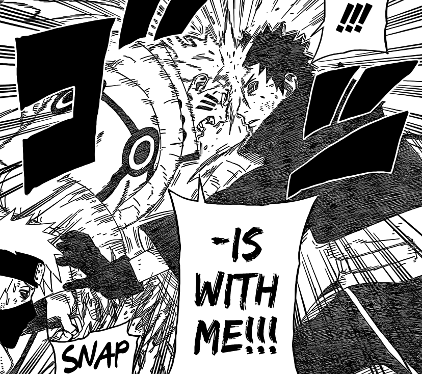 Obito reaches his other hand towards Kakashi’s head, Naruto quickly reaches and hits Obito’s head with his own, he states that Kakashi is with him! Obito is pushed back. The large thing has also started to crack, Bee says that he wants to take care of it!