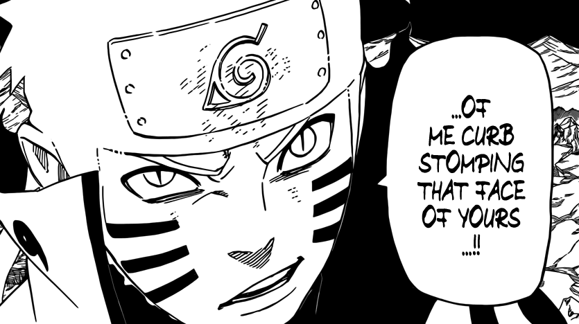 Naruto says that he’s got an image on his head of how Naruto will be stomping his face with all he’s got! Obito quickly thinks that he’s going to get serious and going to be kicking Kakashi’s ass, he keeps on going towards Naruto and Obito. Kurama asks Naruto to switch with him, Naruto agrees.