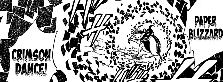 She releases her Paper Blizzard, Crimson Dance which spins a large number of paper round and round towards Natsu. He proposes that he’s going to burn all of them with his magic, but after doing this, it doesn’t work as she mentions that her crimson paper is the God of Flames.