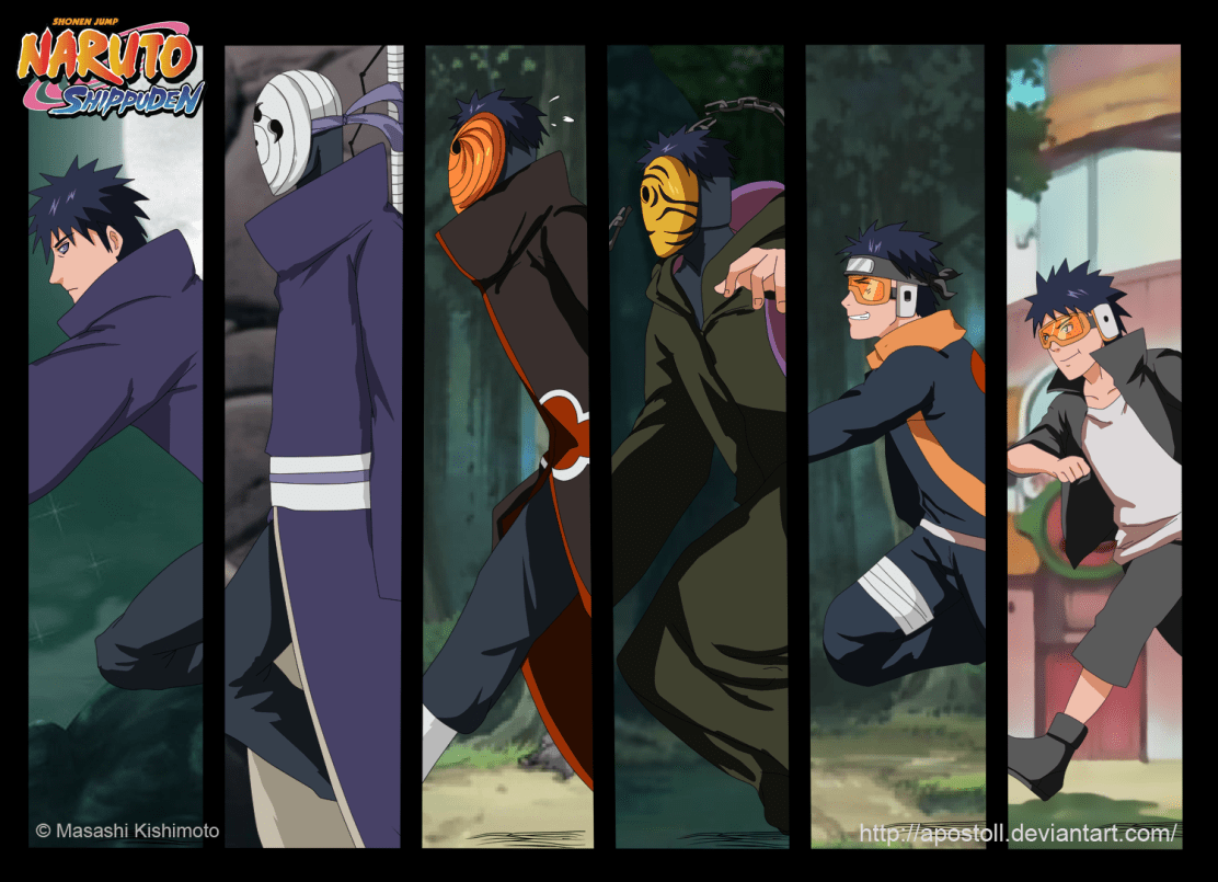 The next one he goes around as Tobi within the Akatsuki as a stupid looking member. The one after that, he’s got his special war mask, which is the mask which was broken by Naruto. The last on the left is Obito himself showing his appearance, he’s most up to date appearance while he fights Kakashi and Naruto.