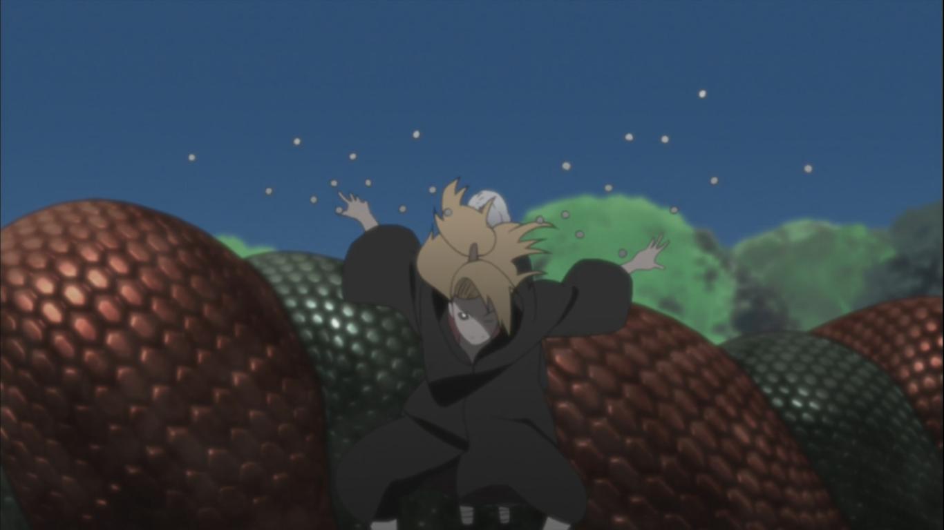 He notices that time’s up and quickly shuts down the Edo Tensei users, Kabuto then brings large snakes out of the ground helping him to defend if any of them were to attack. Deidara appears and allows both of them to escape as he uses his smoke bombs to quickly and securely escape from that place.