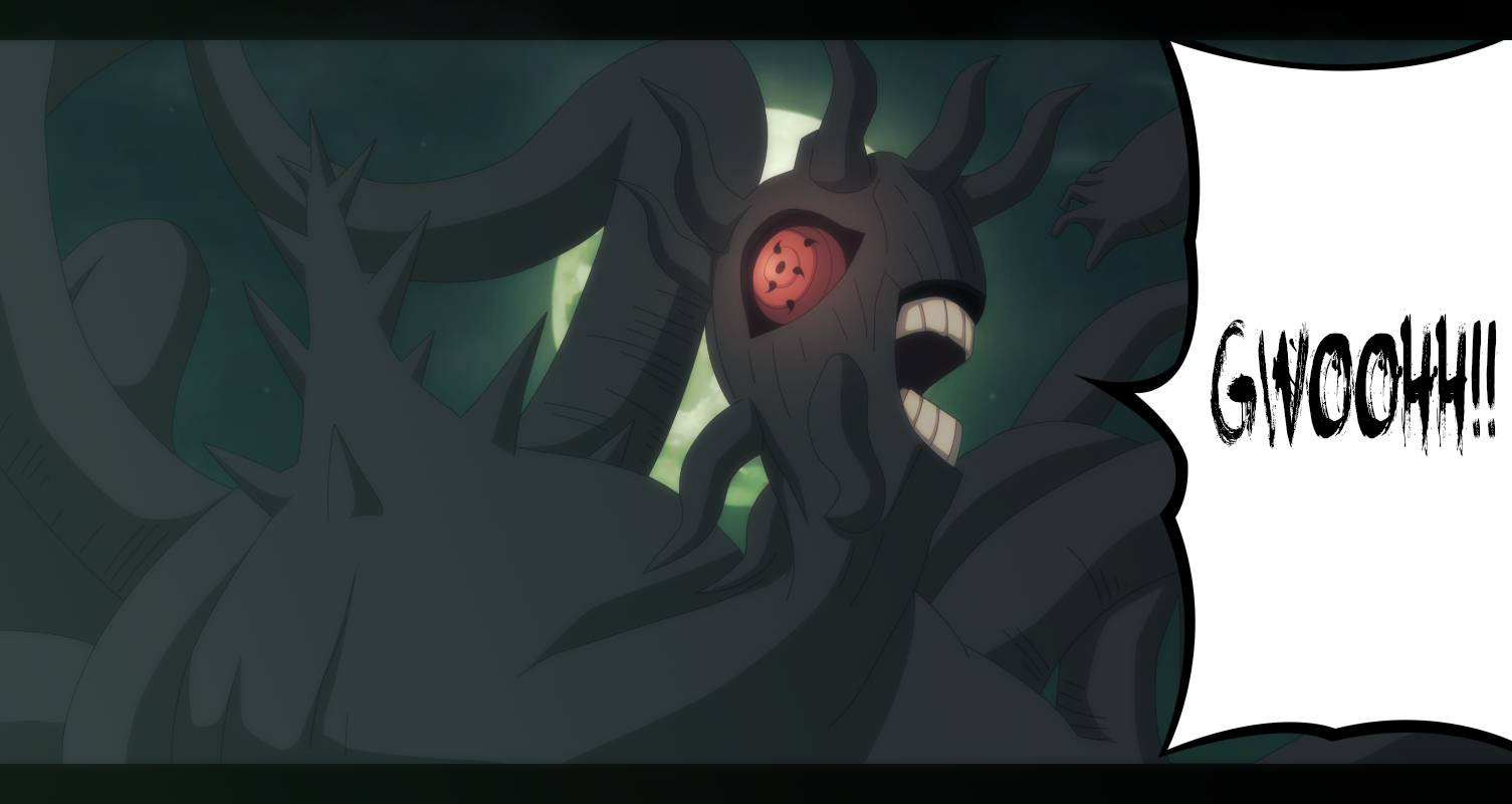 Out of nowhere, the Ten Tails rises from the ground, not having three sides to his face, one with the eye, the other with an ear and the other side with a mouth. It raises itself from the ground, it looks as though it’s form has not yet been fully recovered, even with its power it’s not yet at its full power limit.