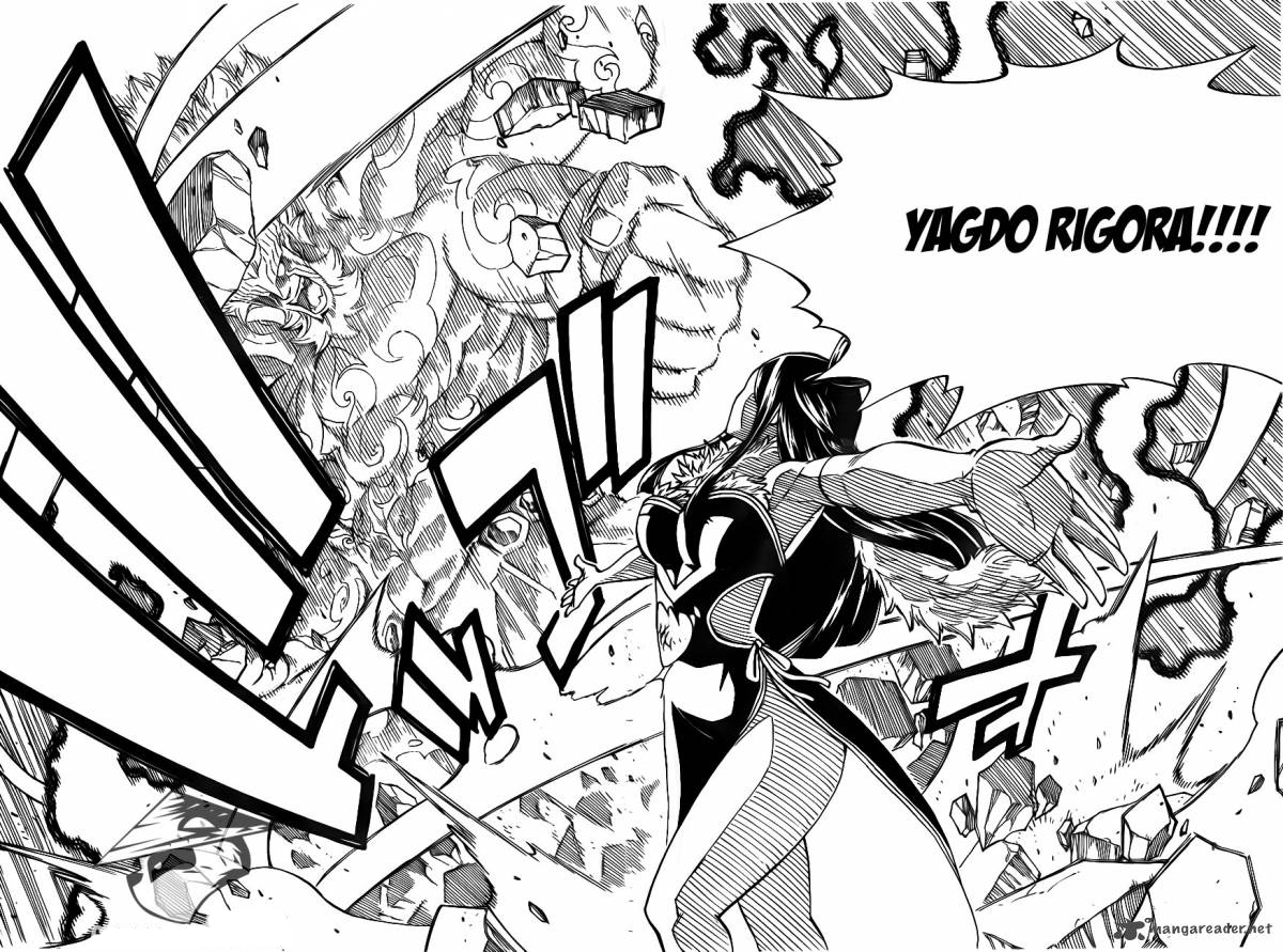 After some time, Minerva uses her technique, she does a hand sign which gets both Erza and Kagura in her technique, she says I Ragudo, which does this. Then says Neer Wirg Mion, Derus Elcantias. At this point Mavis quickly recognizes this as Yakuma’s magic of the 18 Gods of battle. Now, Minerva unleashes her wrath saying, Yagdo Rigora! This unleashing a large being which absolutely destroys everything in that space.