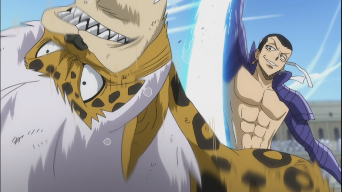 It seems like Blacksnake wants to help him up, but in fact just swipes the sock and rips it right in front of Toby. Everyone notices this and he starts to cry. Fairy Tail notices that it’s just the true nature of Raven Tail. The next match begins, between Bacchus against Elfman!