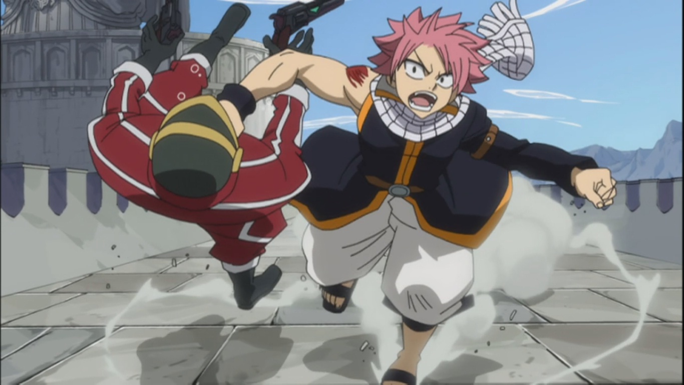 Elfman doesn’t even get through the bet, he just gets straight to it. Natsu wakes up seeing that Wendy, Carla and Porlyusica are all missing, he smells something fishy and notices that some people have taken all three of them. At this point, Natsu runs towards them, smashing each and everyone one of them down!