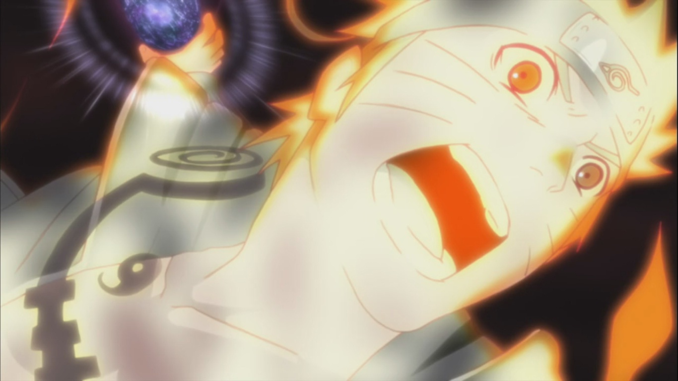 Mina is faced by a degrading Naruto, his forms is reduced to a human size, all the kids tell Naruto’s form to save both their mother and father. They all scream it out when Naruto quickly transforms into his awesome new Chakra Mode! At the same time, Shiseru tells Dokku that she’s ready to die and that he now needs to save the world and protect the children. She loves him so much!