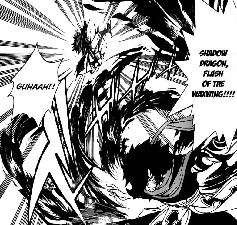 When Gajeel goes to say something, Rogue appears and kicks Gajeel out of there, he’s really quick! Gajeel mentions that he doesn’t know what happened, he guesses that he wants to fight to the end. Gajeel uses his Sword of the Iron Dragon, but Rogue turns into Shadow so it goes right through him. The shadow gets closer and attacks Gajeel using his Flash of the Waxwing technique!