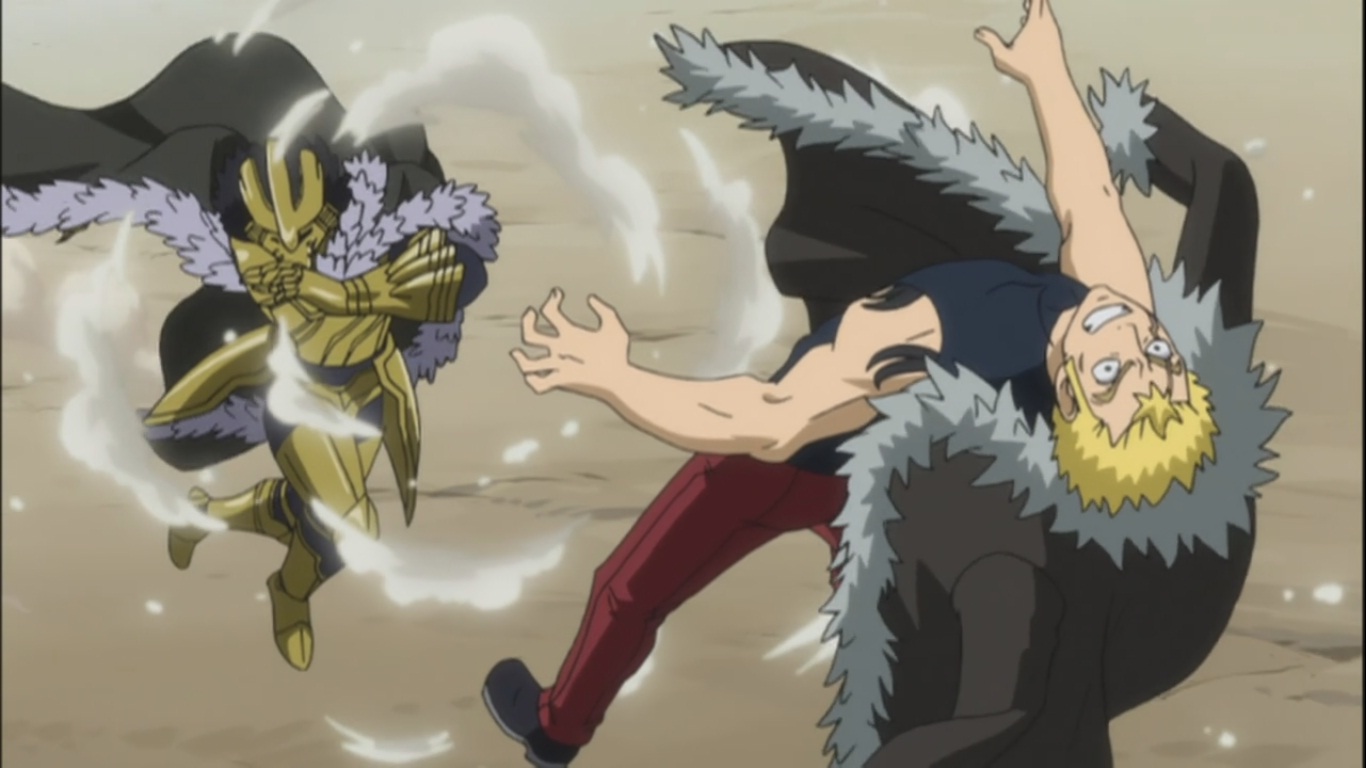 everyone keeps on looking at them, Makarov has even told some members of Fairy Tail to watch over Ivan and the Raven Tail team in case something goes wrong. We go into another dimension when we find out that Laxus is not really being hurt but actually it’s an illusion from Alexei himself! Anyone looking at the fight seems to think that Laxus is getting his ass beat!