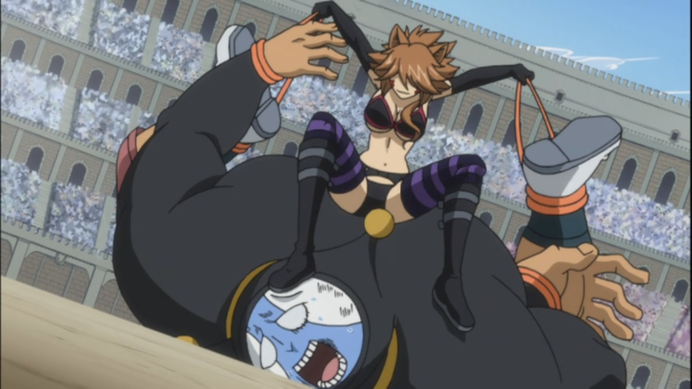 Fairy Tail 168 originally begins with the first match up which are Millianna from Mermaid Heel against Semas from Quatro Puppy! The battle begins with with Semas spinning as hard as he can, he uses this advantage in order to push Millianna around even after a few dodges. Wild Four are proud to show how good they are but after a little while, Millianna gets the courage to fight once more!