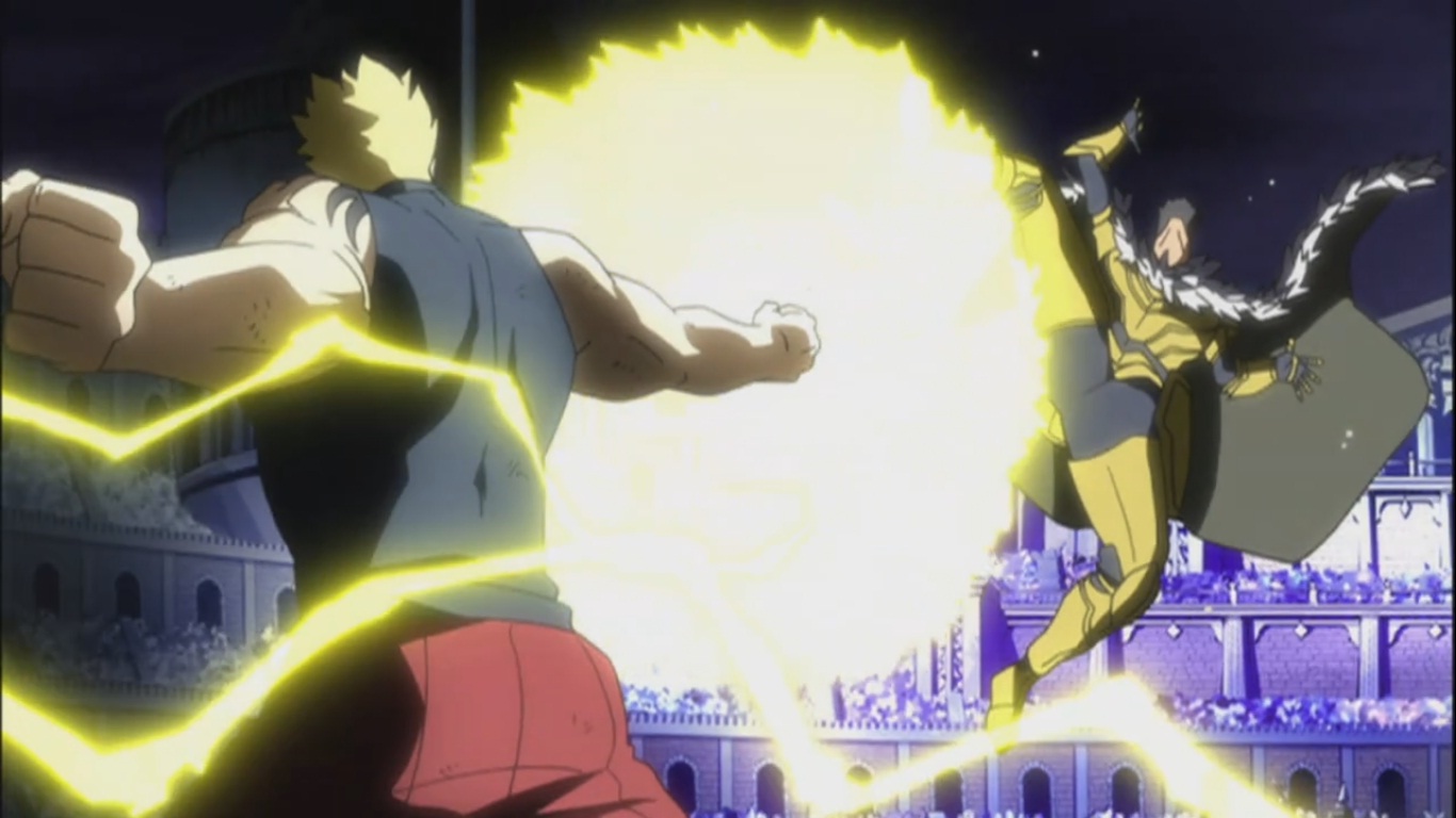 We return to the match, where Laxus tells him that he had a little faith in him, Ivan gets pissed and starts using his magic to attack Laxus! Laxus is on the defensive, he tells Laxus that he’s been looking for it for a long time, Ivan goes on an attack using his magic, but somehow Laxus is able to survive this attack!