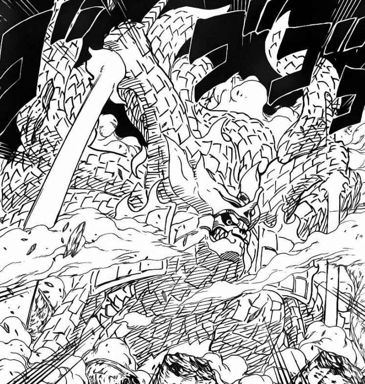Unfortunately for Hashirama, the wood based creature he had splits in half, Hashirama realizes what Madara had done, he smiles and calls Madara smart, at this point, it seems like Madara’s Susanoo is going for the attack. Hashirama quickly holds the sword using his wooden hands telling him that he can predict how he’s going to use his sword! Another sword comes from the left of Kurama, which takes off the top of the surrounding mountains!