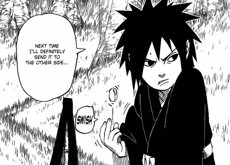 We go to the past when we notice a very young Madara tries to throw rocks against a river bed towards the other shore. Unfortunately it doesn’t reach it, he mentions that he wants to get it to the other side as soon as possible! A rock from behind him appears, this rock quickly reaches the other side with no ease.