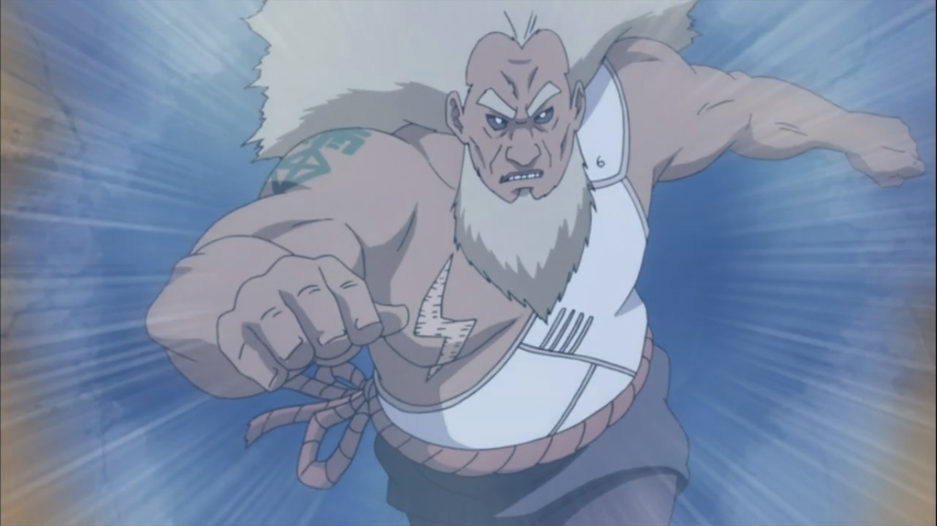 He tells the Earth people to make a large wall, to which they quickly do. Naruto is taken by Dodai when the Raikage goes for him. Dodai uses his justu to cover the side with his rubber to help prevent the Raikage from pushing through. The Raikage starts his destruction at one end and starts getting closer using his hand. He explains that he’s using his most lethal weapon, the piercing four-fingered thrust of hell!