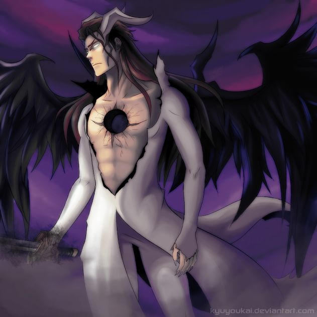 Aizen’s main Hollow form, when he fought against Ichigo’s Full Getsuga Tenshou was pretty epic! But this artist has come up with an alternative aspect to what one of the looks Aizen would develop. Something similar that has similar wings to Ulquiorra and even a sword to help him battle. What else could look better on awesome Aizen? I think this image and look is epic enough.