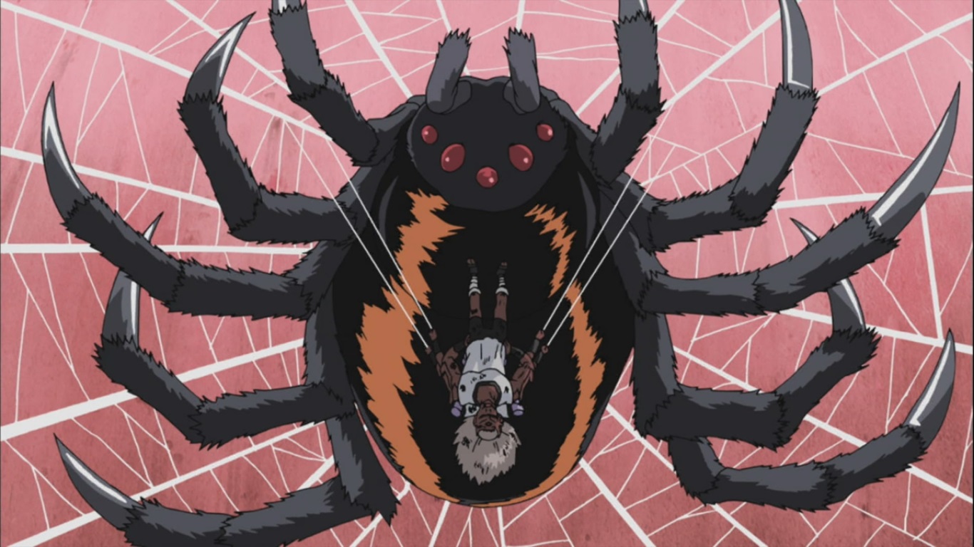 Neji runs towards the barriers and the large summoned spider, Kiba uses smoke to get closer to Tayuya, Shikamaru gets both Sakon and Ukon in his mimic technique. Neji was used to distract them, Neji jumps up in order to get closer to Kidomaru which he does, he uses his palm technique in order to destroy the spider.