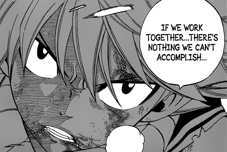 Blue Pegasus already know that it’s Cobra from Oracion Seis. Lahar and Doranbolt talk about talking to Jellal, they worry about what’s about to happen to them, however they must save the present for them to live in the future. They also decide to join the battle. Natsu mentions that everyone’s giving it their all, if they work together, there’s nothing they can’t accomplish!