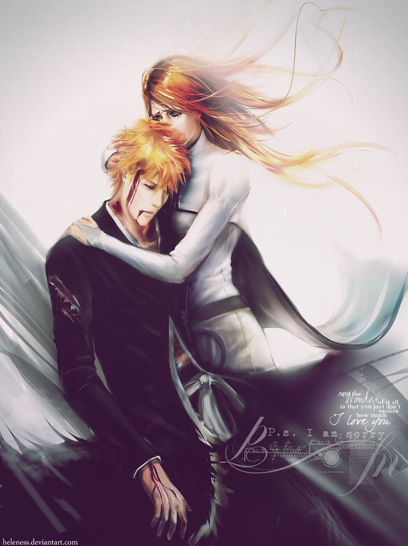This incredible image of both Ichigo Kurosaki and Orihime Inoue reminds me of the great fight in which Ichigo had against both Grimmjow and Ulquiorra! Both times, Ichigo wasn’t not up to their level, and until he defeated them, he lost badly, but he never gave up. Orihime by his side made sure of that since she was never gave up on him either. The title of this image describes the moment in which Ichigo went crazy into his Hollow Form and defeated Ulquiorra in mere seconds.