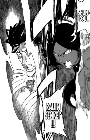 Yoruichi’s Shunkou Raijin Senkei on Askin Published on December 26, 2015 in Yoruichi and Yushiro vs Askin Nakk Le Vaar! – Bleach 657Full resolution (842 × 1300) < Previous Next >