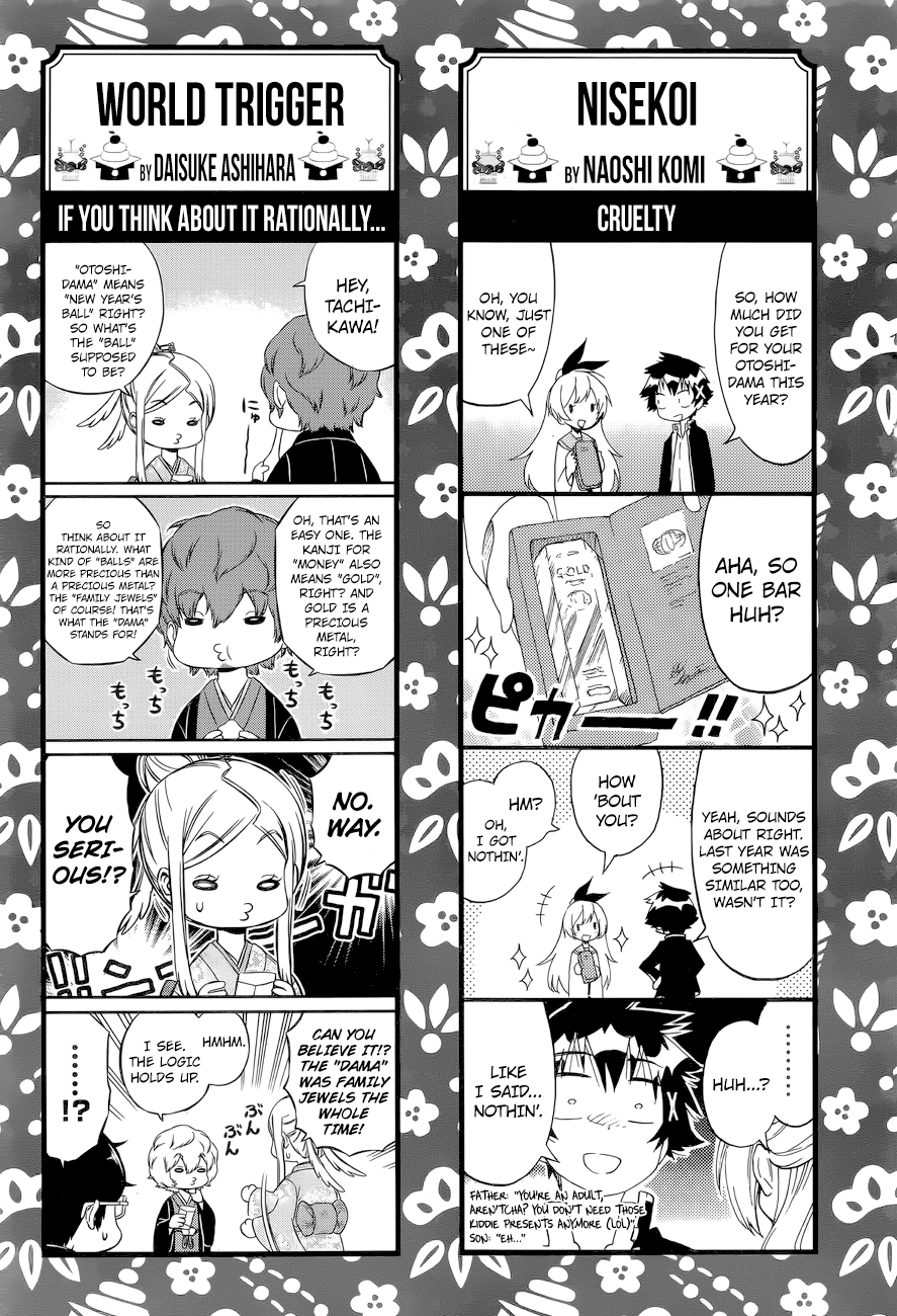 World Trigger and Nisekoi New Year Special Published on January 1, 2016 in Mangaka’s Draw One Shot New Years SpecialFull resolution (887 × 1300) < Previous Next >