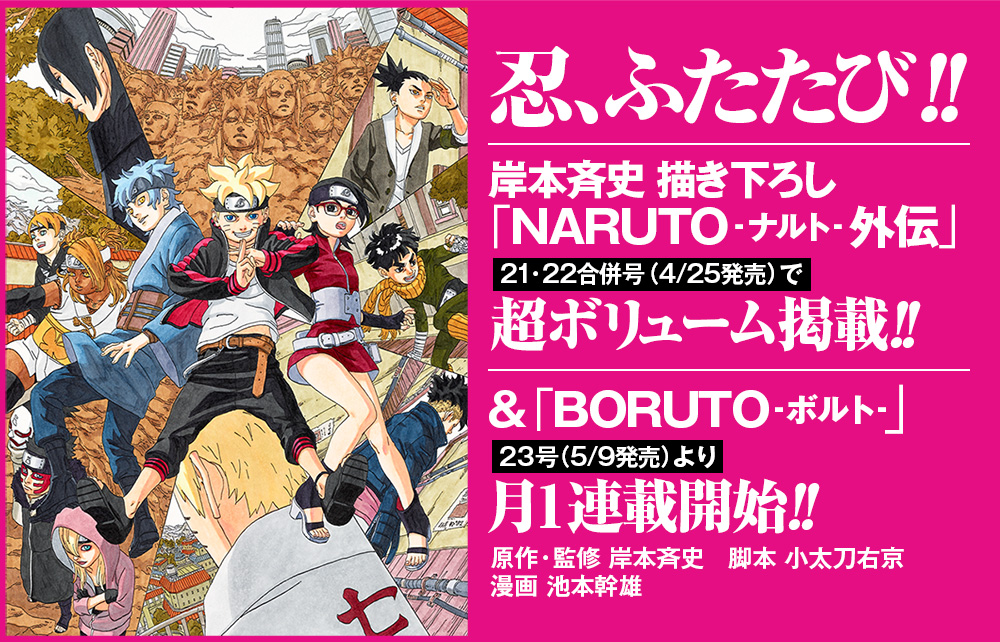On top of this, Masashi Kishimoto will also publish a one-shot for his original Naruto manga in this year’s combined 22nd and 23rd issues on the 25th of April. Mikie Ikemoto, who worked as an assistant under Kishimoto will be drawing Boruto, all while Kishimoto supervises the manga. The manga script focuses on Boruto and thus will be written by Ukyo Kodachi, who has done previous work within Naruto.