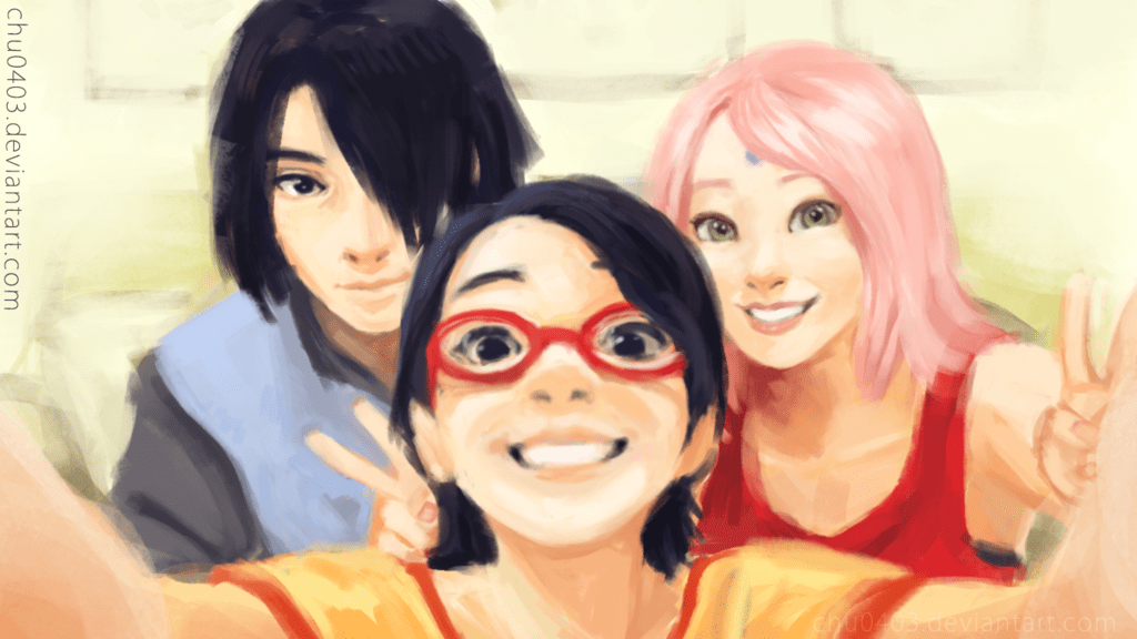 This fantastic artwork of the three was done by chu0403 who has a number of fantastic pieces of artwork based on Sakura and other characters. If you like this style, there is more of it on their page. Otherwise be sure to share this fantastic fan art of Sasuke, Sakura and Sarada.
